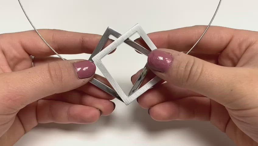 Dit collier bestaat uit twee grote open vierkanten die over elkaar zijn geplaatst. De onderste twee punten passen goed in elkaar en openen met een magneetsluiting door deze twee vierkanten van elkaar te nemen. Dit collier kun je combineren met andere items uit onze collectie zoals de kleine, vierkante oorknopjes O37mat of de vierkante creolen O11mat en de ring R6. Tijdloos en basic in de vormgeving.